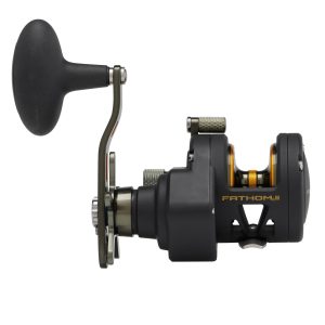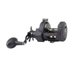 The second generation PENN Fathom II star drag reel is built with a rigid metal frame and sideplates. now with added features to make it more angler friendly than ever. Featuring our fast gear access sideplate. any angler can service their gears and HT-100 drag system quickly and efficiently. The PENN live spindle design offers long. effortless casts. while the power gear ratios (select models only) give ultimate torque for winching up deep fish. Magnetic casting brake available on 12 and 15 sizes only.